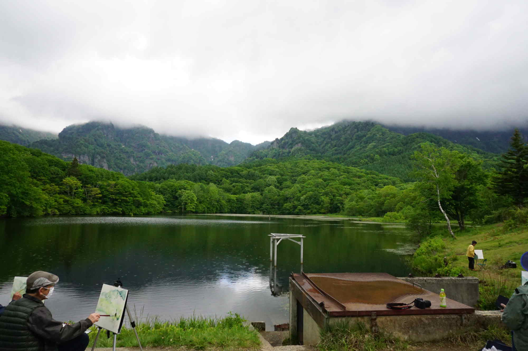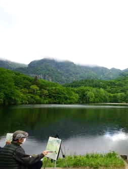 団体で絵描きに訪れた人たちにも多少動揺が感じられる鏡池でした。
